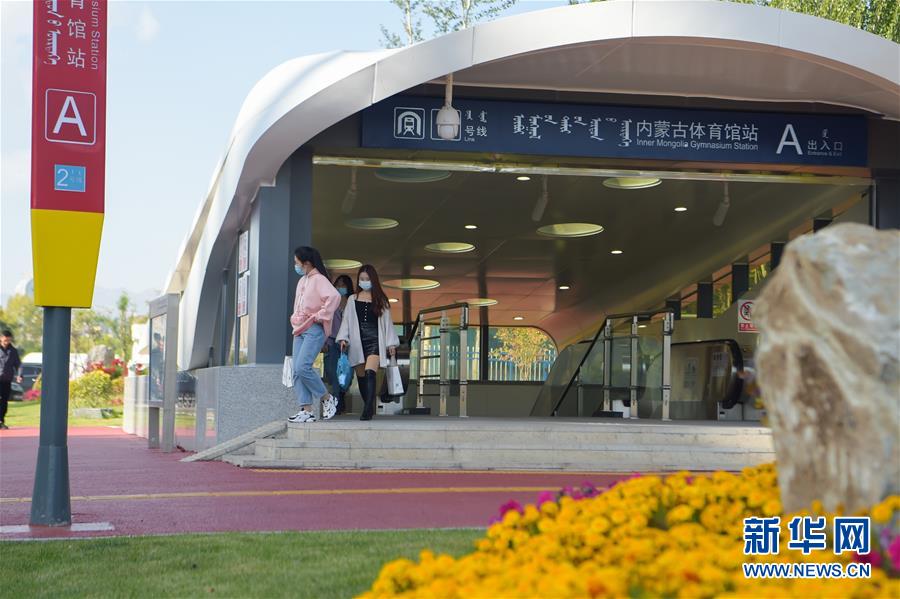 10月1日,市民走出呼和浩特地铁2号线内蒙古体育馆站的出入口。 当日,内蒙古自治区呼和浩特市地铁2号线开通初期运营。呼和浩特地铁2号线全长27.3公里,共设车站24座,可与地铁1号线实现换乘,方便市民出行。 新华社记者 朱文哲 摄