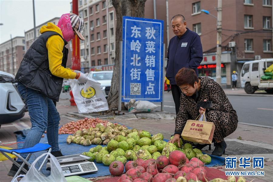 10月1日,在长春市东岭北街一处秋菜销售点,市民挑选秋菜。 当日,长春市秋菜进入销售季。2020年长春市秋菜登市时间为10月1日至25日,入市菜农须在指定地点销售。 新华社记者 张楠 摄