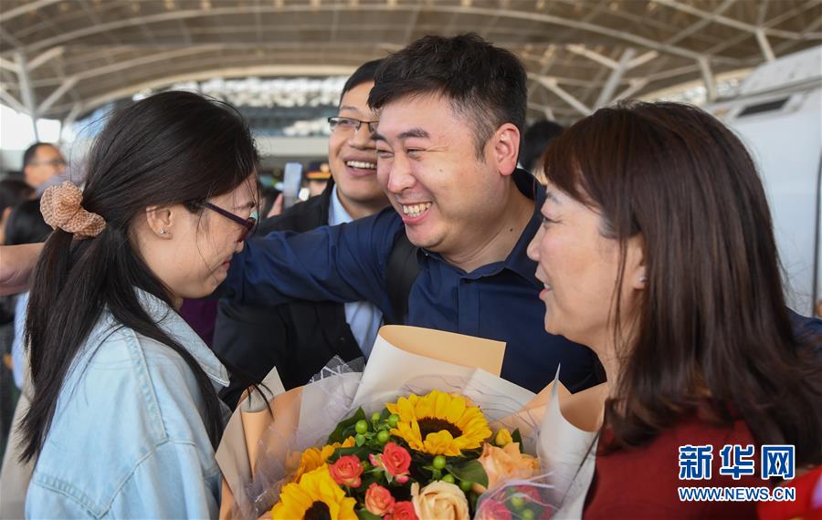10月1日,武汉市江夏区第一人民医院重症医学科的护士长倪宝红(右一)、梁文(左一)在武汉火车站迎接曾经一起战斗的江苏援鄂医疗队员贾凌(右二)。 当日,一批驰援过武汉抗疫的江苏医疗队队员前来武汉游玩,曾经一起战斗过的武汉医护人员们来到武汉火车站迎接,曾经的战友再度相逢。 新华社记者 程敏 摄