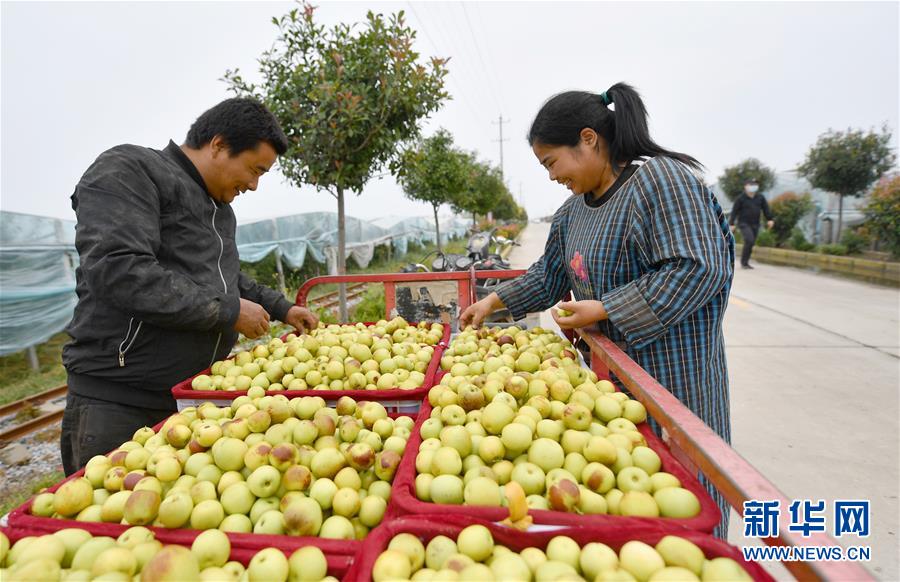9月22日,陕西省大荔县小坡村果农整理刚采摘的冬枣。 新华社记者 张博文 摄