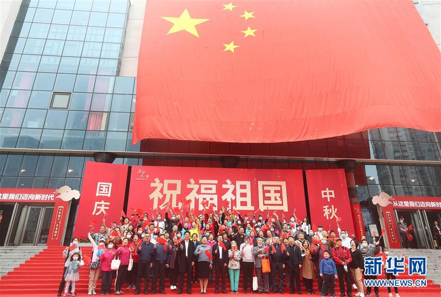 10月1日,嘉宾与国旗合影。 当日,北京市朝阳区新时代文明实践中心以“祝福祖国”为主题,在朝阳区文化馆举办国庆专题活动,以快闪舞蹈、专题展览、电影放映、爱国宣讲等一系列丰富多彩的文化活动,表达对祖国的美好祝福。 新华社记者 金良快 摄