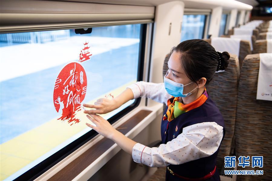 10月1日,在G6131次列车上,乘务员在旅客上车前抓紧布置车厢。 当日,在岳阳东开往广州南的G6131次“复兴号”高铁列车上,长沙客运段高铁动一车队和长沙客运段团委的工作人员在列车上开展“喜迎国庆浓情中秋”活动。车厢内张灯结彩,列车乘务员与旅客们一起在欢声笑语中庆祝国庆和中秋佳节。 新华社记者 陈思汗 摄