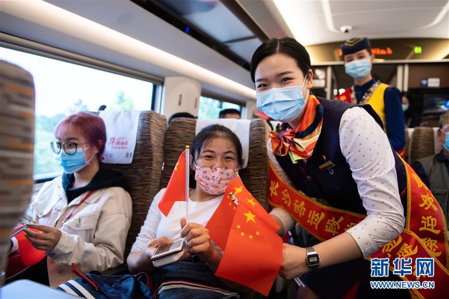 10月1日,在G6131次列车上,乘务员给旅客发国旗。 当日,在岳阳东开往广州南的G6131次“复兴号”高铁列车上,长沙客运段高铁动一车队和长沙客运段团委的工作人员在列车上开展“喜迎国庆浓情中秋”活动。车厢内张灯结彩,列车乘务员与旅客们一起在欢声笑语中庆祝国庆和中秋佳节。 新华社记者 陈思汗 摄