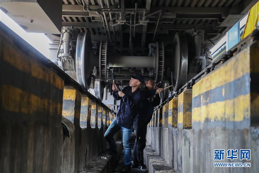 10月1日,曹亚民(左)和同事进行列车检车作业。新华社记者 马希平 摄