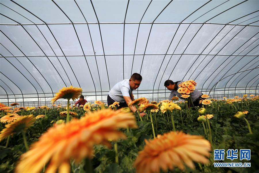 10月2日,在江苏省泗洪县界集镇后钟洼村的非洲菊种植基地,陈超(左)带着工作人员在大棚里采摘非洲菊。 泗洪县后钟洼村村民陈超和杜美英夫妻利用在大学学到的农学知识和在外务工时积累的花卉种植经验,于2019年回村创业,夫妻俩在村里流转50亩土地,搭建了25个大棚种植非洲菊。大棚釆取“基地+农户”模式,吸收低收入的农民在基地务工。夫妻俩还将乡村旅游与非洲菊种植相融合,实现种、产、销、观光一体化经营,带动乡亲增收致富。 新华社发(许昌亮 摄)