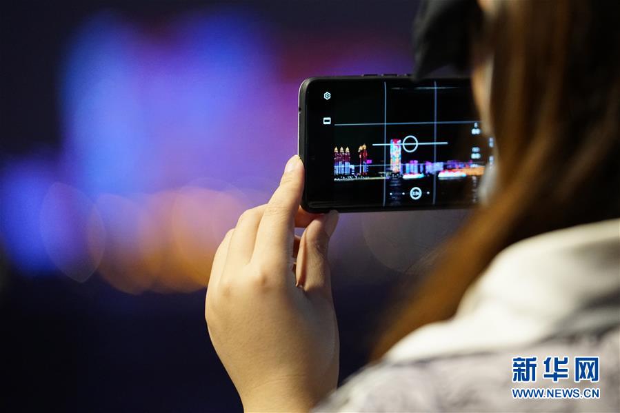 9月30日晚,一位女孩在武汉江滩用手机拍摄灯光秀。新华社记者 冯国栋 摄