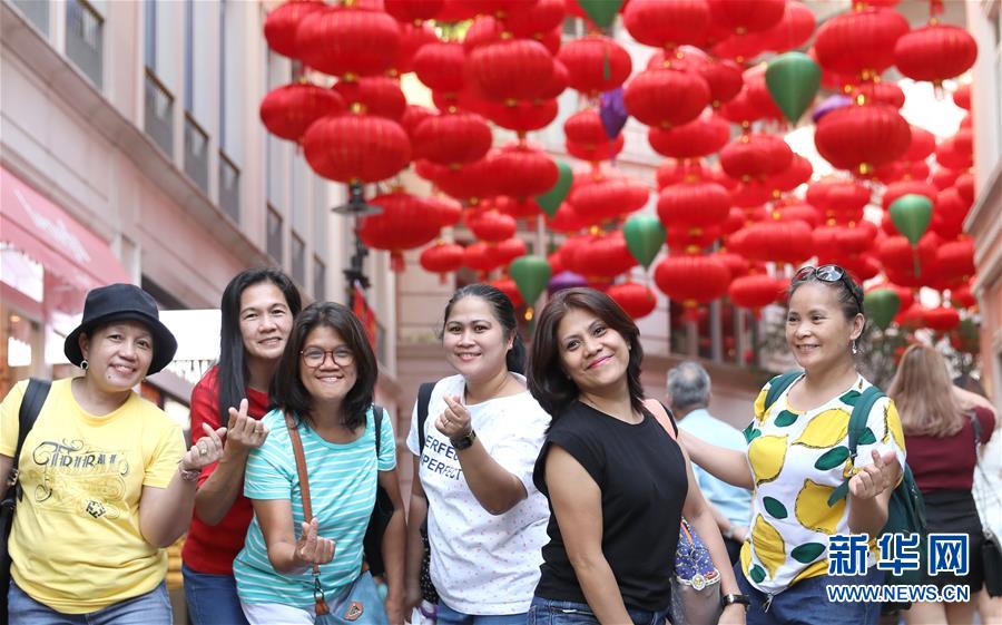 10月2日,游客在香港利东街拍照。 为欢庆国庆和中秋佳节,香港利东街悬挂国旗和大红灯笼,喜庆气氛吸引不少游客前来游览拍照。 新华社记者 吴晓初 摄