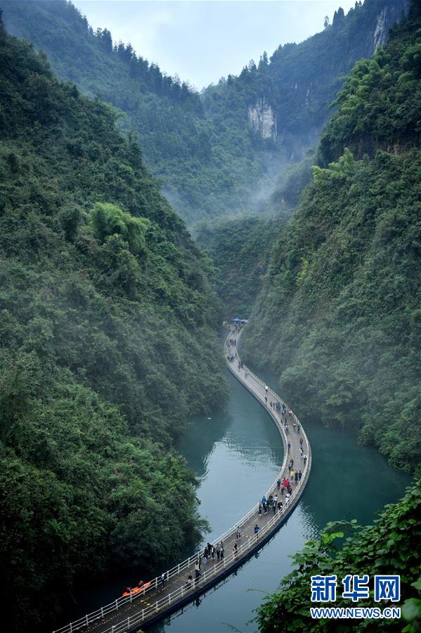 10月2日,游客在湖北省宣恩县狮子关风景区水上栈道游玩。 国庆中秋长假期间,人们纷纷走出家门,走进田园山水之间,亲近自然,乐享假日好时光。 新华社发(宋文 摄)