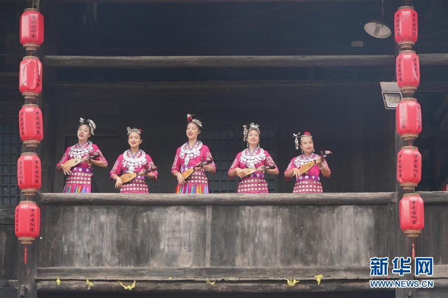 10月1日,在湖南省通道侗族自治县双江镇芋头村,侗族群众载歌载舞欢庆佳节。 国庆中秋长假期间,各地举办丰富多彩的民俗活动,欢度假日。 新华社发(吴三东 摄)