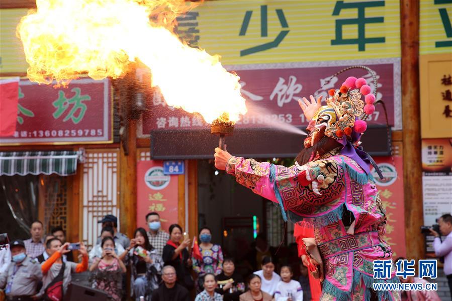 10月1日,在四川省内江市东兴区东兴老街,川剧演员为观众表演“变脸吐火”。 国庆中秋长假期间,各地举办丰富多彩的民俗活动,欢度假日。 新华社发(兰自涛 摄)