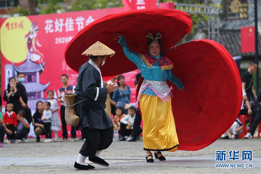 10月2日,贵州省锦屏县隆里古城的居民在进行民俗表演。 国庆中秋长假期间,各地举办丰富多彩的民俗活动,欢度假日。 新华社发(杨晓海 摄)