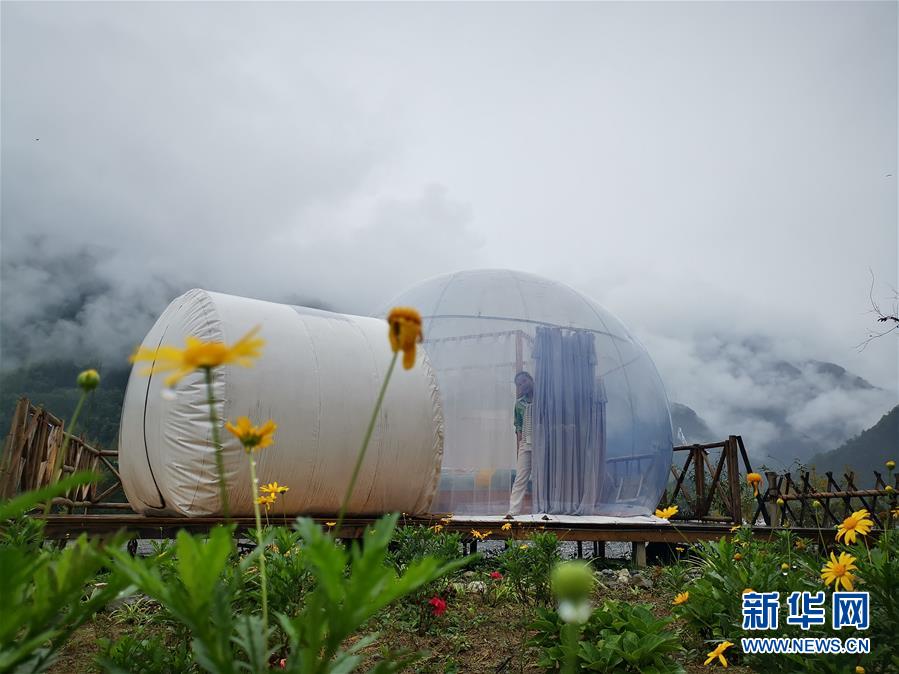 在四川省绵竹市清平镇,帐篷营地“管家”刘光兰在透明“泡泡屋”中(10月1日手机拍摄)。 新华社记者 谢佼 摄