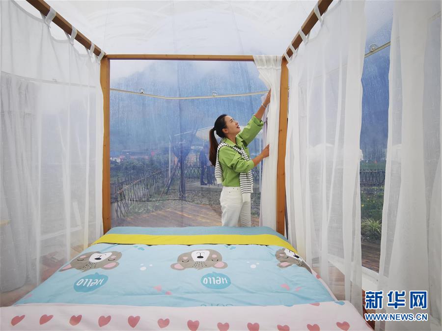 在四川省绵竹市清平镇,帐篷营地“管家”刘光兰在整理“泡泡屋”内的床品(10月1日手机拍摄)。 新华社记者 谢佼 摄