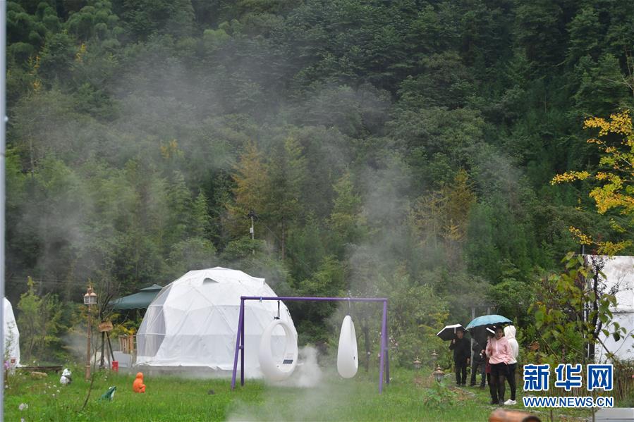 10月1日,游客撑着伞漫步在四川省绵竹市清平镇的帐篷营地中。 新华社记者 谢佼 摄