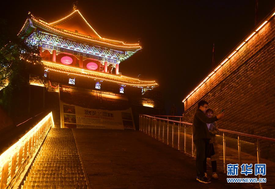 10月2日,游客在开封城墙景区自拍留念。 国庆长假期间,河南省开封市通过延长景区开放时间、举办夜间文化活动、规范夜市经营等措施,鼓励引导夜间旅游、文化、餐饮等活动,提升城市夜间活力,吸引了众多游客前来参观游玩。 新华社记者 李嘉南 摄