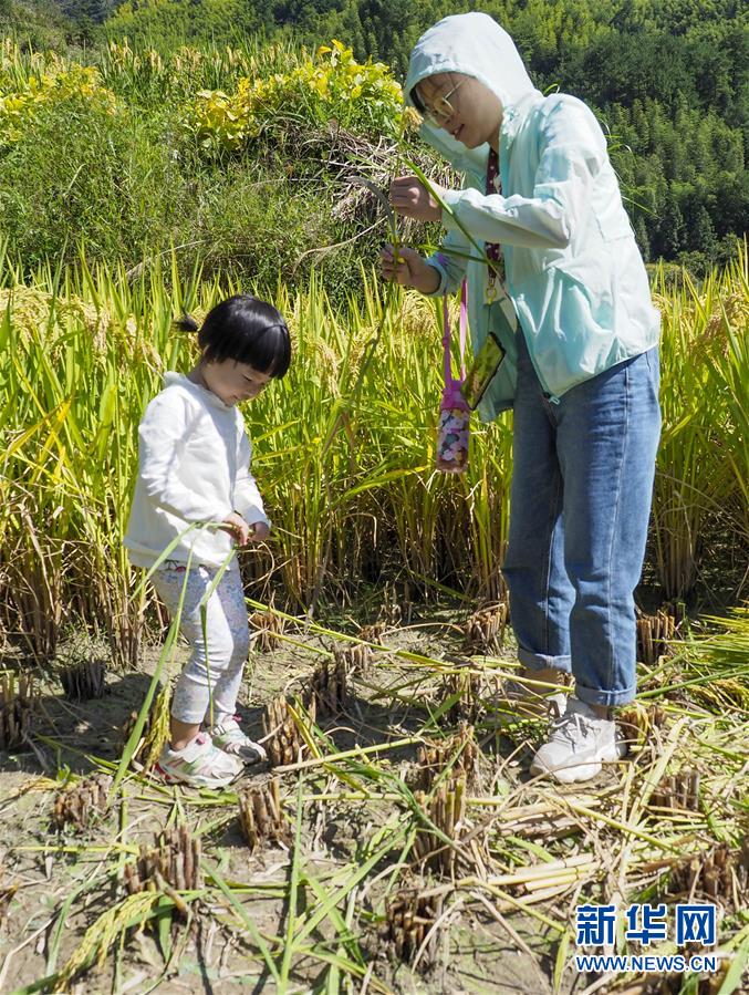 10月3日,在景宁县小佐梯田,一名小朋友在妈妈的陪伴下体验农事。 国庆长假期间,一场秋收农事体验活动在浙江省丽水市景宁畲族自治县小佐梯田举行。游客通过参与割水稻、稻穗脱粒等秋收农事活动,体验收获的喜悦。 新华社发(李肃人 摄)