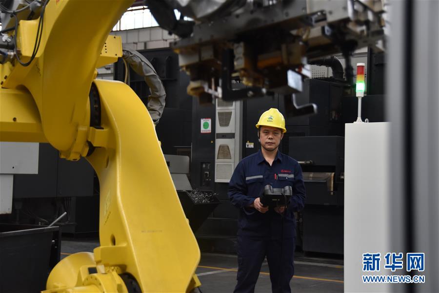 9月29日,三一重工“70后”铣工张新古在车间练习机器人编程。 新华社记者 白田田 摄