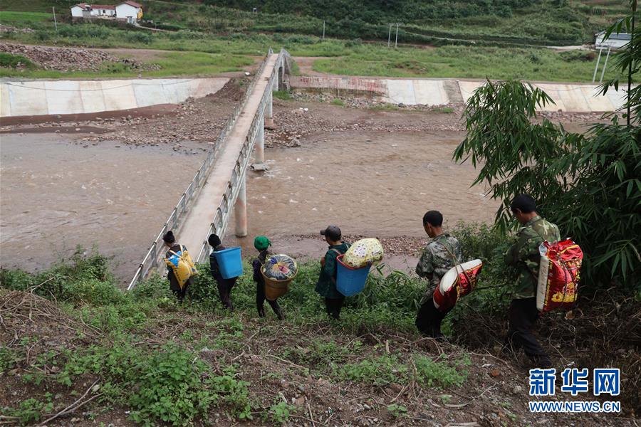 10月3日,翁姑伍支木(左二)和邻居从成昆铁路联合乡站徒步前往喜德县且托乡三呷果村。 新华社发(胡仲平 摄)