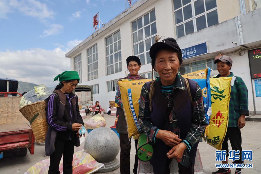 10月3日,翁姑伍支木(前)和邻居背着采购的生活物资在成昆铁路冕宁站准备乘坐5634次列车到联合乡站回家。 新华社发(胡仲平 摄)