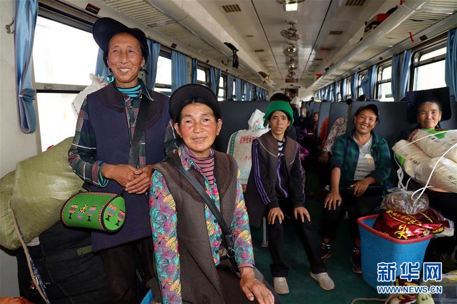 10月3日,翁姑伍支木(左一)和邻居在5634次列车上。 新华社发(胡仲平 摄)