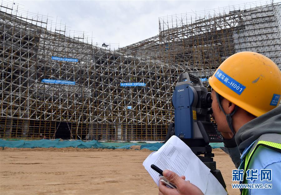 10月4日,在河南省科技馆新馆建设项目工地,中建三局工人在进行测量作业。 当日是中秋和国庆假期第四天,在河南省科技馆新馆建设项目工地,不少工人坚守工作岗位,在忙碌中度过假期。 新华社记者 李嘉南 摄