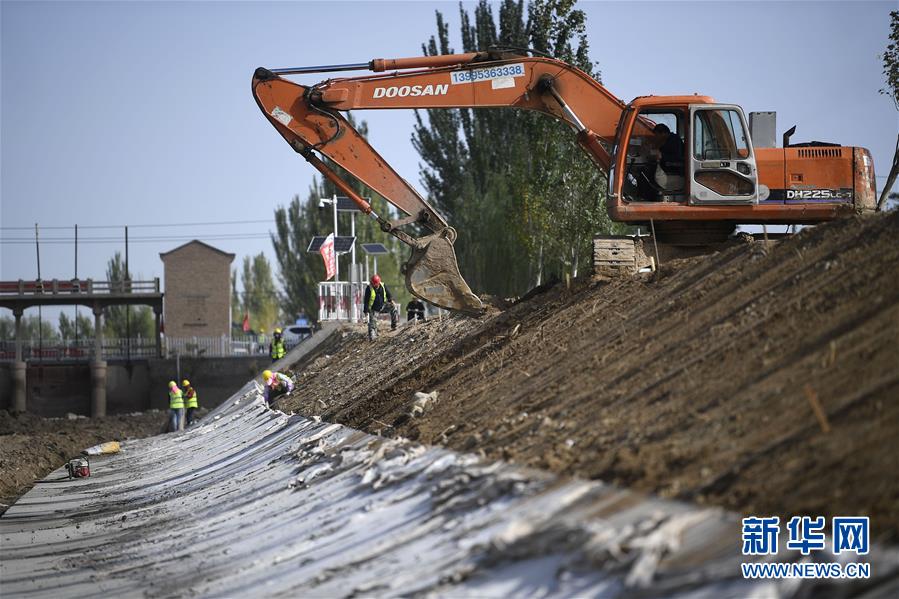 宁夏水利工程建设中心施工人员在惠农渠银川市贺兰县境内渠道进行施工改造(10月3日摄)。 为推进节水型、生态型现代化灌区建设,宁夏水利部门利用秋季农田水利建设窗口期,对宁夏境内的惠农渠进行砌护整治和节水改造,并对现有水利信息化系统进行集成和升级改造。 据了解,现代化灌区建设项目2019年惠农渠节水改造工程主要改造包括干渠砌护、支干渠改造、配套干渠渠堤巡护道路等,并对砌护改造范围内55座建筑物进行升级改造。预计该项目将于2021年6月底完工,投入使用后可增加干渠输水流量6立方米/秒,解决6.4万亩农田灌溉困难问题,年节水约250万方。 新华社记者 王鹏 摄