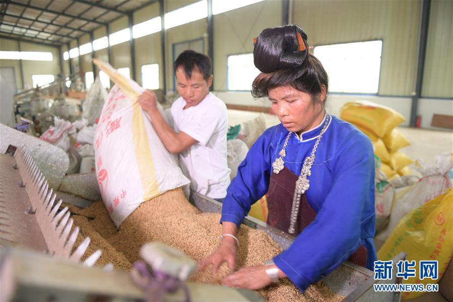 10月4日,在丹寨县一家茶叶生产企业,村民利用烘干设备烘干稻谷。 日前,贵州省黔东南苗族侗族自治州丹寨县的8.5万亩水稻正值收割期。受降雨天气影响,丹寨县发动党员干部、退伍军人及驻村工作者等组成义务抢收队,帮助群众抢收稻谷。同时,拥有烘干设备的茶叶生产企业免费为村民烘干稻谷,确保颗粒归仓。 新华社记者 杨楹 摄