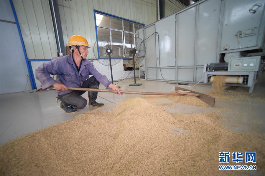 10月4日,在丹寨县一家茶叶生产企业,村民整理已烘干的稻谷。 日前,贵州省黔东南苗族侗族自治州丹寨县的8.5万亩水稻正值收割期。受降雨天气影响,丹寨县发动党员干部、退伍军人及驻村工作者等组成义务抢收队,帮助群众抢收稻谷。同时,拥有烘干设备的茶叶生产企业免费为村民烘干稻谷,确保颗粒归仓。 新华社记者 杨楹 摄