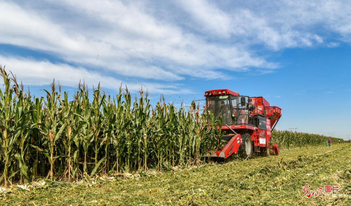 2020年10月4日,大型农机在河北省石家庄市栾城区南高乡南高村恒丰种植专业合作社的玉米大田里收获玉米。连日来,当地农户和合作者抢抓农时收获、晾晒、加工玉米供应市场。(李明发摄/光明图片)