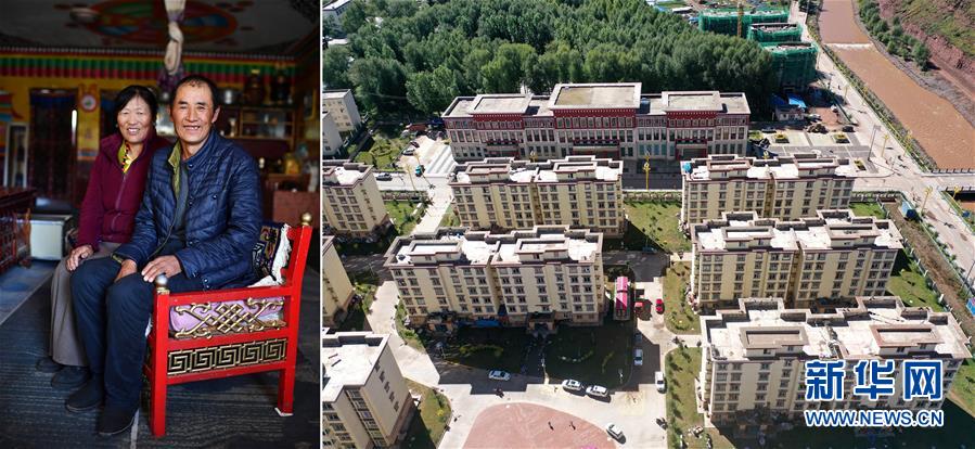 拼版照片:左图为西藏自治区昌都市贡觉县则巴乡夏日村村民白玛罗布和妻子卓嘎拉姆在安置点家中(9月27日摄);右图为贡觉县精准扶贫易地搬迁县城1号安置点一角(9月27日摄,无人机照片)。2018年11月,白玛罗布和家人从夏日村搬迁到安置点,住进了165.5平方米的新居。安置点紧挨贡觉县城,白玛罗布的孩子们在县城也都找到了工作。 新华社记者 詹彦 摄