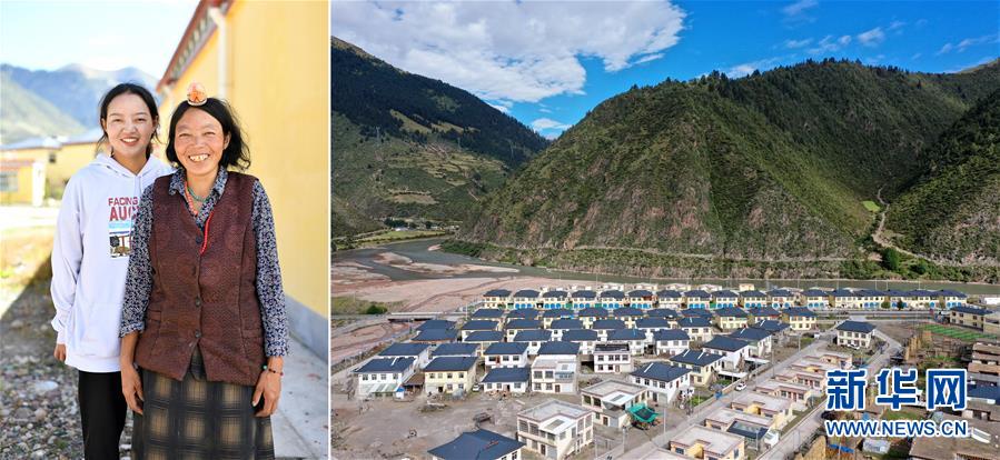 拼版照片:左图为西藏自治区昌都市类乌齐县恩达村村民美郎措姆(右)和女儿伍金巴措在新居前(9月21日摄);右图为类乌齐县恩达村一角(9月21日摄,无人机照片)。2018年,美郎措姆和家人从旧村搬迁到了新村,新村设施齐全,交通便利。和美郎措姆一家一样,旧村的100多位村民告别了旧房子,住进了宽敞明亮的新居。 新华社记者 詹彦 摄