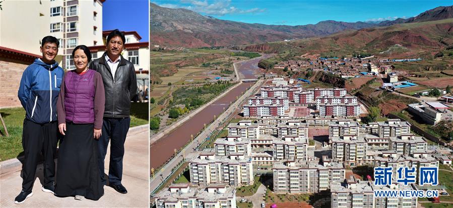 拼版照片:左图为西藏自治区昌都市贡觉县则巴乡卫通村村民日嘎(右)和妻子益西(中)、儿子贡衮在安置点楼前(9月27日摄);右图为贡觉县精准扶贫易地搬迁县城1号安置点一角(9月27日摄,无人机照片)。2018年,日嘎一家搬迁到贡觉县精准扶贫易地搬迁县城1号安置点,住进了82.5平方米的新房子。在安置点,和日嘎一家一样,从贡觉县莫洛镇、相皮乡、拉妥乡等地搬迁来的2000多名群众开启了更加美好的生活。 新华社记者 詹彦 摄