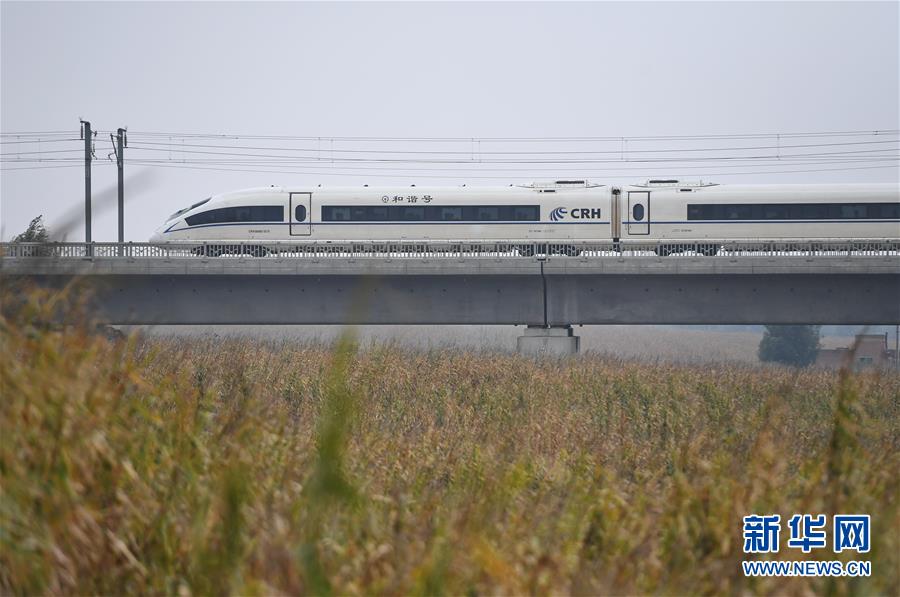 在吉林省四平市梨树县,一列高铁列车驶过玉米田(9月28日摄)。新华社记者 张楠 摄