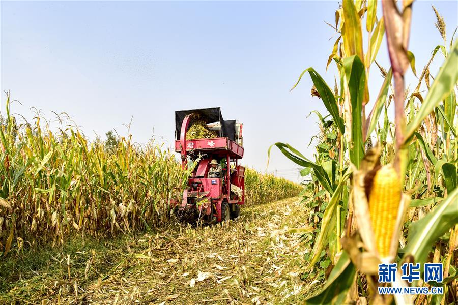 10月7日,河北省涿州市百尺竿镇西疃村村民在收割玉米。 寒露将至,各地农民抢抓农时开展农事活动。 新华社发(刘永兴 摄)