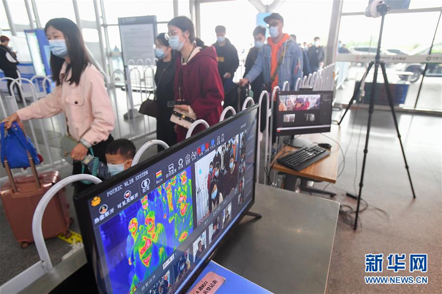 10月8日,旅客在长沙南站进站口通过体温检测设备。 国庆长假临近尾声,多地交通运输部门迎来返程客流高峰。 新华社记者 陈泽国 摄