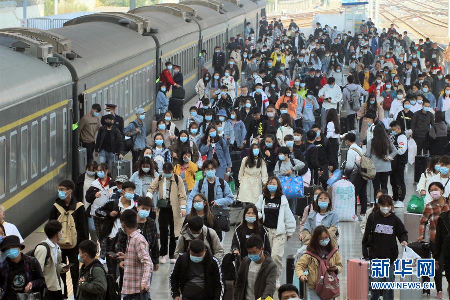 10月8日,旅客在山东烟台火车站下车出站。 国庆长假临近尾声,多地交通运输部门迎来返程客流高峰。 新华社发(唐克 摄)
