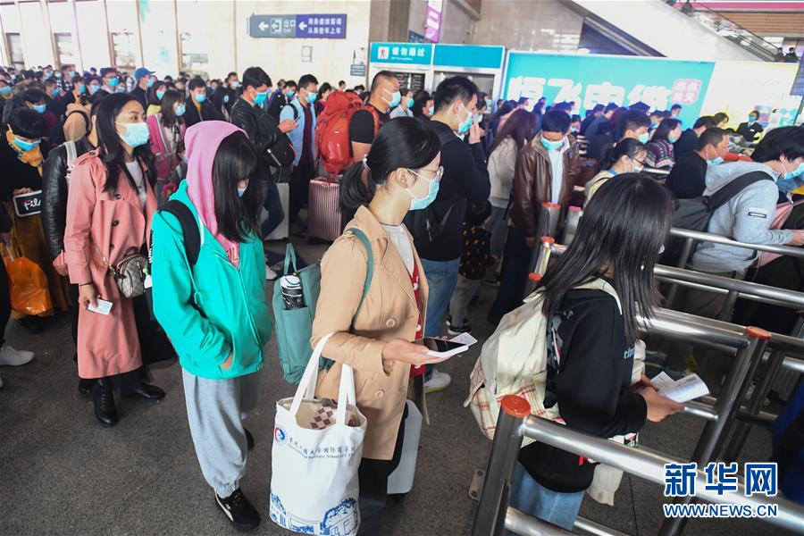 10月8日,旅客在长沙南站进站口排队验票。 国庆长假临近尾声,多地交通运输部门迎来返程客流高峰。 新华社记者 陈泽国 摄
