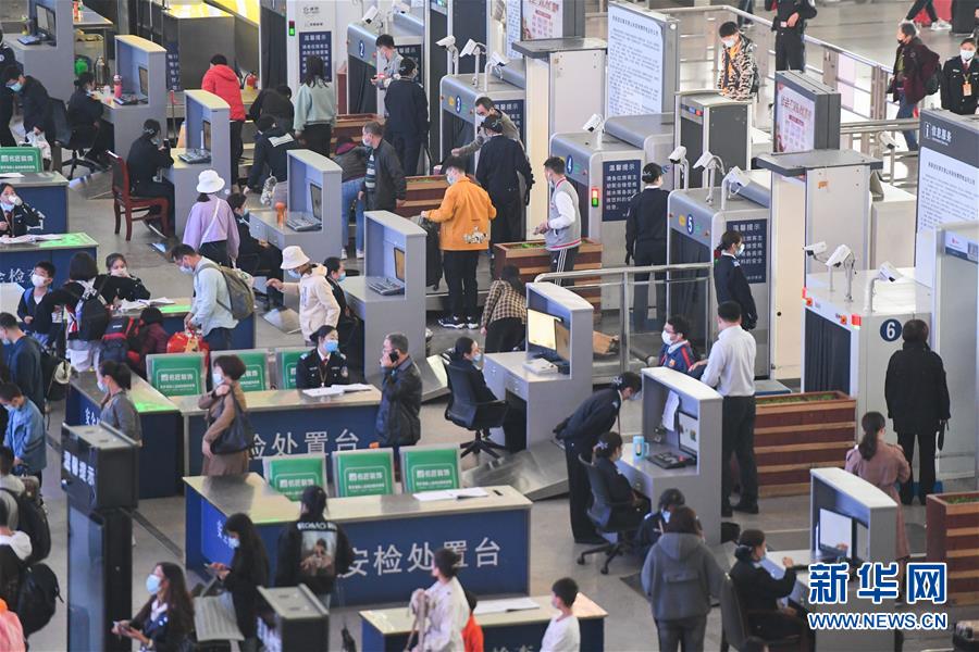 10月8日,旅客通过长沙南站安检处。 国庆长假临近尾声,多地交通运输部门迎来返程客流高峰。 新华社记者 陈泽国 摄