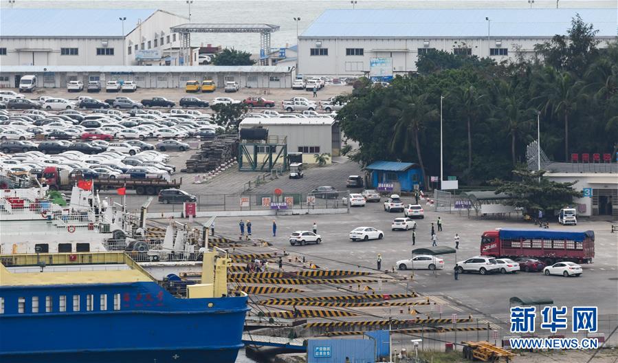 10月8日,在海口秀英港轮渡码头,进岛车辆有序出港,出岛车辆在工作人员指挥下驶入客滚船。 国庆长假临近尾声,多地交通运输部门迎来返程客流高峰。 新华社记者 杨冠宇 摄