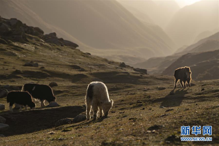 10月8日,牦牛在新疆喀什地区叶城县南部山区的一处高山牧场上吃草。 金秋时节,在新疆叶城县山区,崇山峻岭间觅食的牛羊与远处的雪山相伴,一幅秋日牧歌图在昆仑山间展开。 新华社记者 胡虎虎 摄