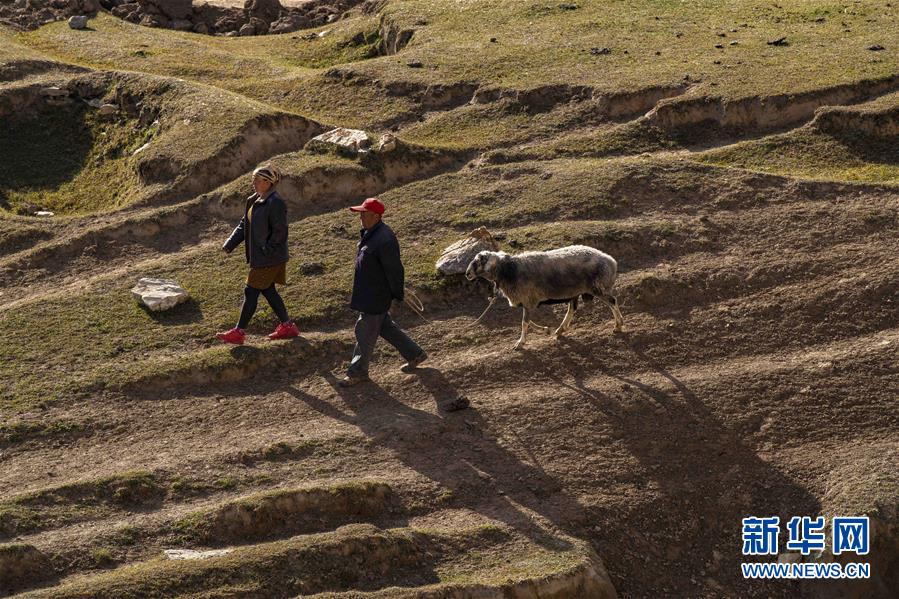 10月8日,在新疆喀什地区叶城县南部山区的一处高山牧场,牧民牵着羊行走在牧道上。 金秋时节,在新疆叶城县山区,崇山峻岭间觅食的牛羊与远处的雪山相伴,一幅秋日牧歌图在昆仑山间展开。 新华社记者 胡虎虎 摄