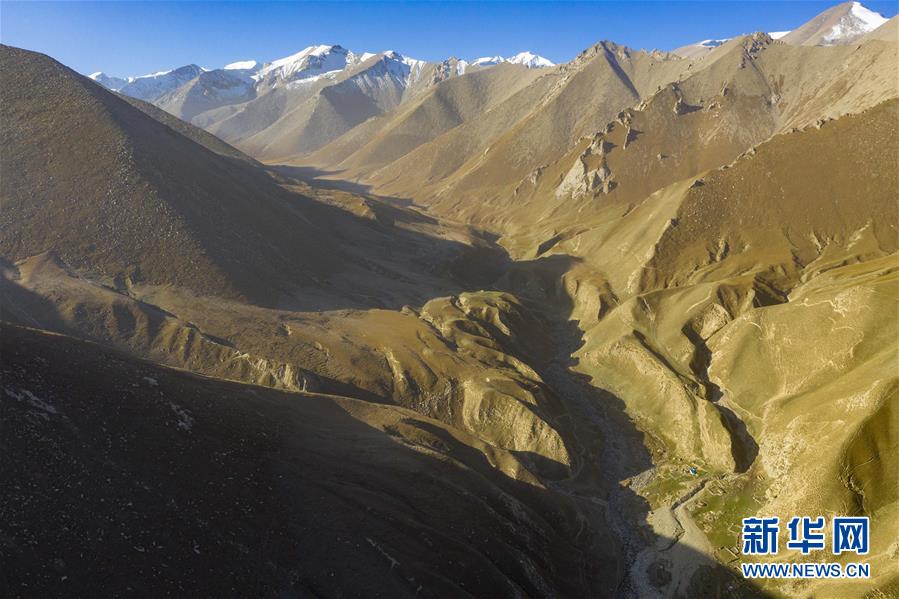 在新疆喀什地区叶城县南部山区拍摄的一处高山牧场(10月8日摄,无人机照片)。 金秋时节,在新疆叶城县山区,崇山峻岭间觅食的牛羊与远处的雪山相伴,一幅秋日牧歌图在昆仑山间展开。 新华社记者 胡虎虎 摄