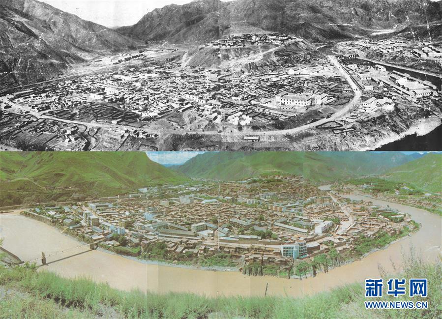 这张拼版照片显示的是:上世纪50年代的昌都(上)和上世纪80年代的昌都景色(资料照片)。