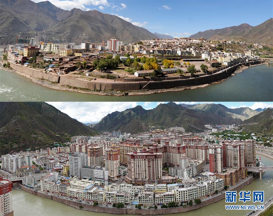 2010年拍摄的昌都市景色(上)和2020年拍摄的昌都市景色(拼版照片)。 新华社记者 普布扎西 摄