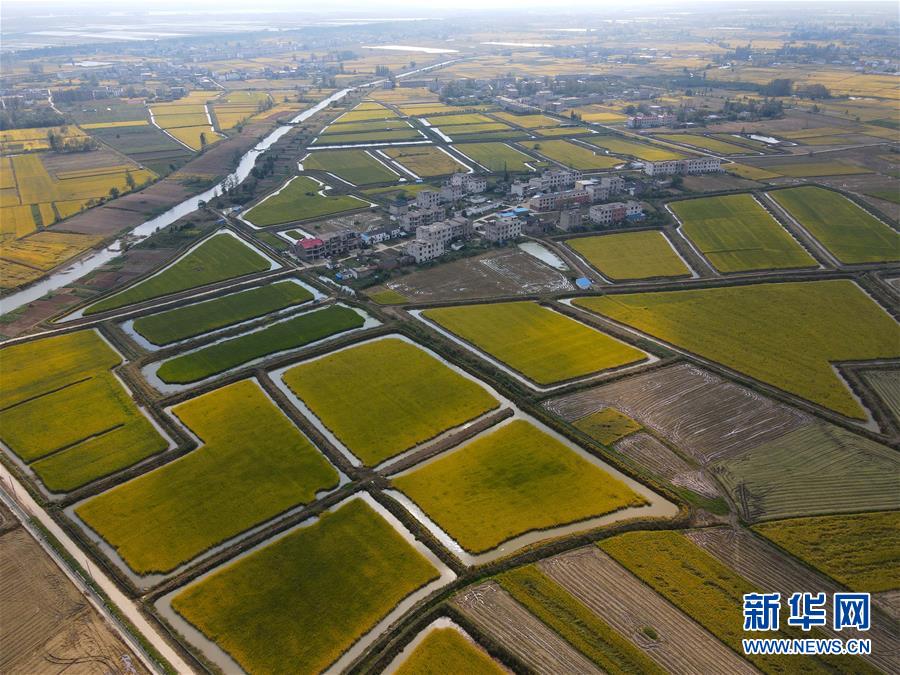 这是10月8日拍摄的颍上县八里河镇的稻田(无人机照片)。 秋收时节,安徽省颍上县农民抢抓农时收割水稻,田间地头一派繁忙景象。 新华社记者 周牧 摄