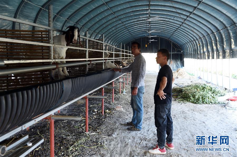 10月8日,在颍上县陈桥镇李庄村,李玉献(左)向村民传授养羊知识。 新华社记者 周牧 摄