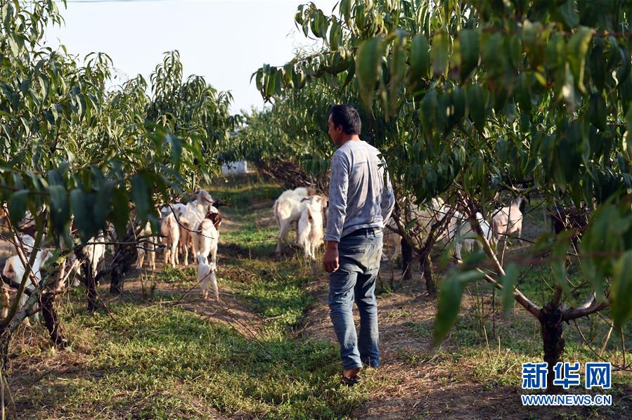 10月8日,在颍上县陈桥镇李庄村,李玉献在屋后果园放羊。 新华社记者 周牧 摄