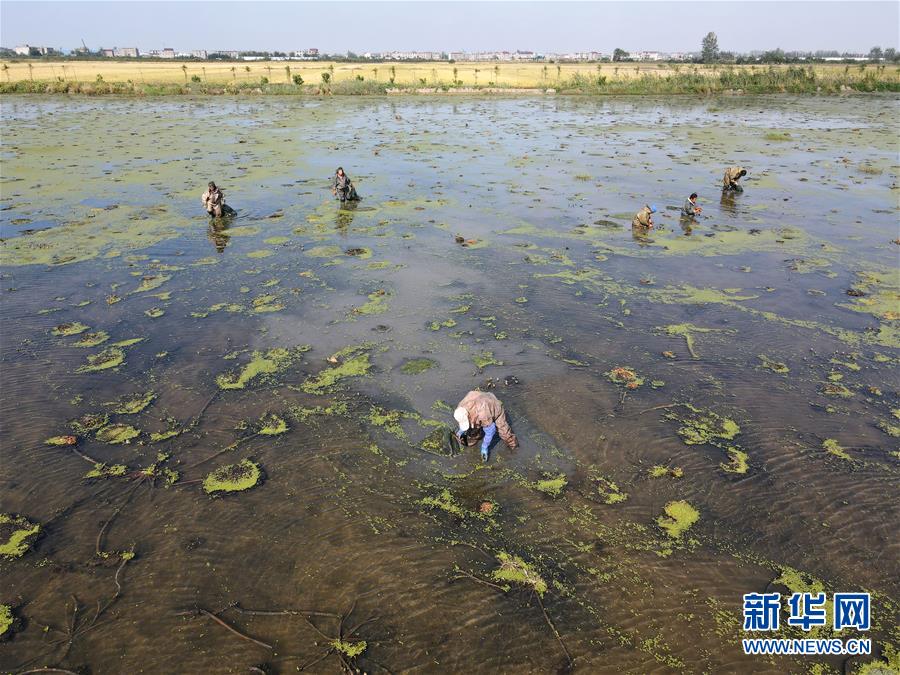 10月8日,在安徽省阜阳市颍上县李庙农作物种植农业专业合作社,村民在采收芡实(无人机照片)。新华社记者 周牧 摄