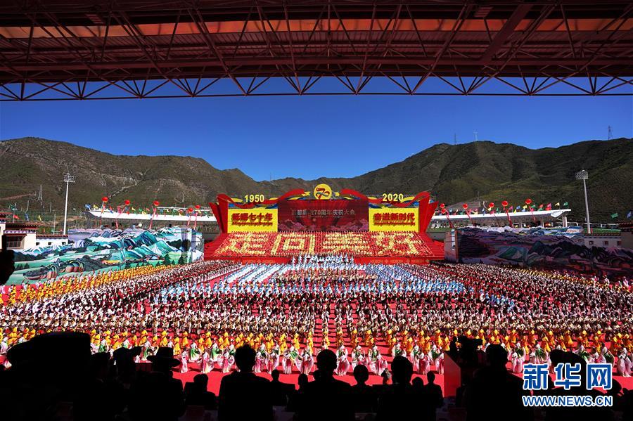 这是10月9日拍摄的西藏昌都解放70周年庆祝大会现场。 当日,西藏昌都解放70周年庆祝大会在昌都市举行。 新华社记者 詹彦 摄