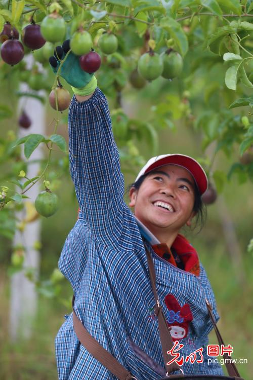 2020年10月9日,村民在贵州省锦屏县新化乡新化寨村的百香果种植基地采摘百香果。眼下,贵州省黔东南苗族侗族自治州锦屏县新化乡新化寨村的百香果种植基地迎来丰收季,当地村民忙着采摘、搬运百香果,供应各地市场。(杨晓海摄/光明图片)